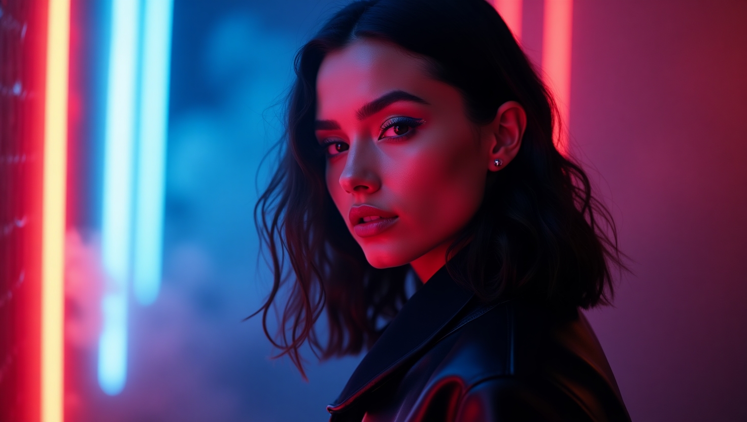 Aesthetic: Neon lights, soft fog, modern minimalism, blue-orange contrast